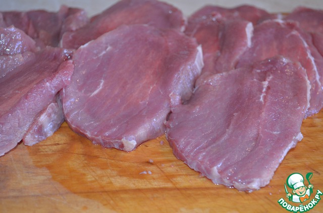 Мясо нарезаем тонкими слоями (5-7 мм). Чем тоньше Вы нарежете мясо, тем вкуснее будут готовые торбы. Из моего кусочка мяса получилось 12 отбивных