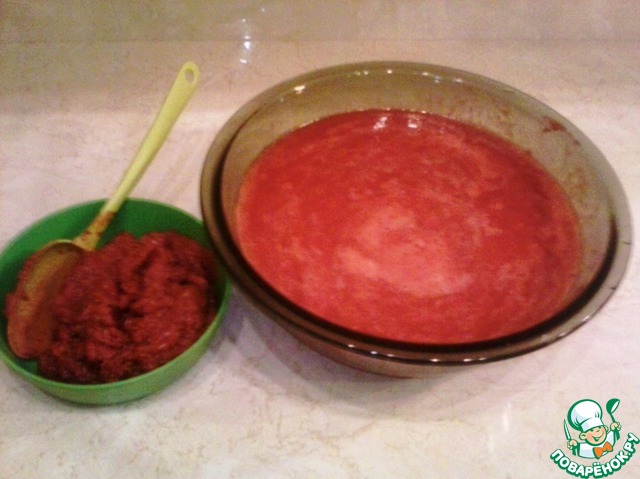 Измельчить в блендере, а затем перетереть через сито, чтобы получилось пюре без косточек. У меня после перетирки через сито получилось 1,6 кг. пюре.