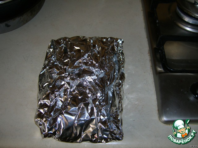 Заворачиваем в фольгу и в холодильник, лучше конечно положить мясо на ночь, оно тогда промариновывается и получается сочнее, я в этот раз положила на полчасика, тоже вкусно получилось.
