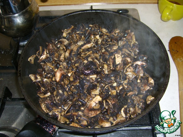 Пока мяско отдыхает, делаем начинку. Шампиньоны режем и обжариваем на сливочном масле, можно грибочки приправить специями, солим.