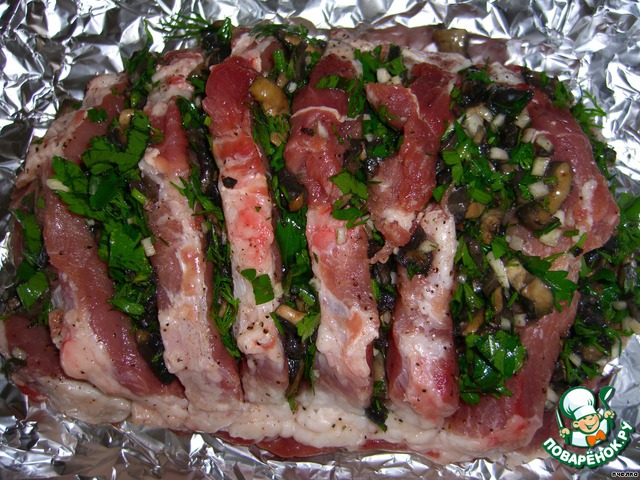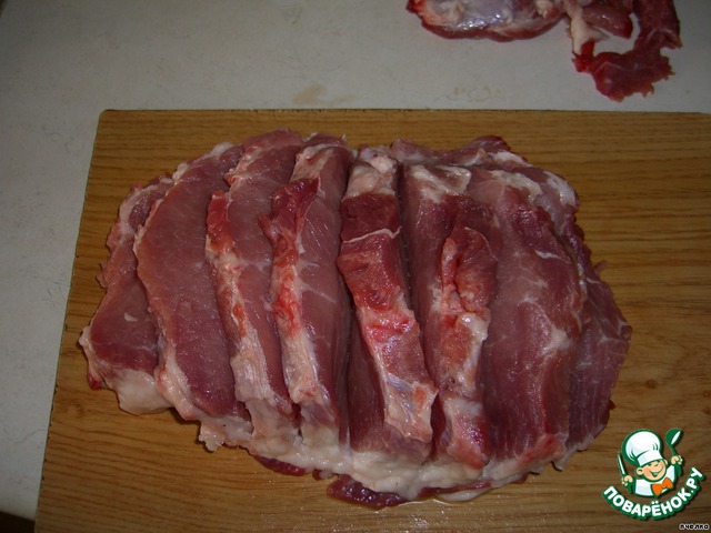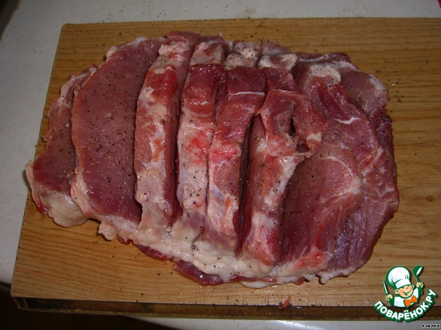 Берем вырезку, нарезаем ее как на отбивные, но не до конца, получается вроде бы как кармашки. Можно брать вырезку и на косточке.