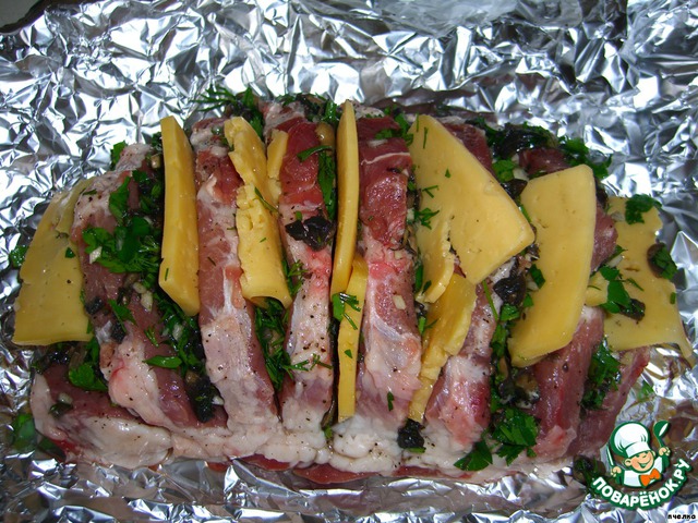 Нарезаем сыр пластинками и вставляем в каждый кармашек. Заворачиваем в фольгу и час на полтора в духовку, периодически вынимая и проверяя готовность. Минут за 10 до окончания запекания раскрываем фольгу и даем образоваться красивой корочке.