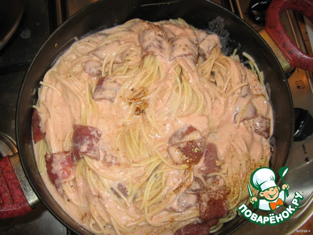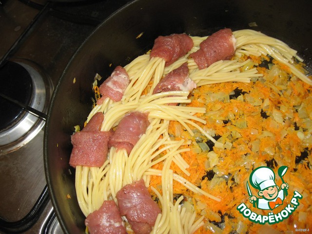 Свинину нарезать, отбить, порезать ленточками шириной 3-4 см, посолить, перчим. Спагетти переломить пополам, аккуратно сложить в кастрюлю и отварить до полуготовности в подсоленной воде. Смазать немножко подсолнечным маслом и дать немного остыть.