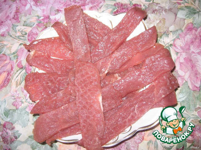 В даном случае я сделала одновременно гарнир с мясом. Если вы хотите преподнести это как мясное блюдо на праздничный стол, макарон понадобится 100 г, то есть по 5-6 шт в каждое мяско, и мясные полоски тогда делать шириной 6-8 см. В любом случае блюдо очень интересное, ароматное и вкусное. Приятного аппетита!