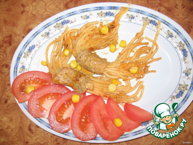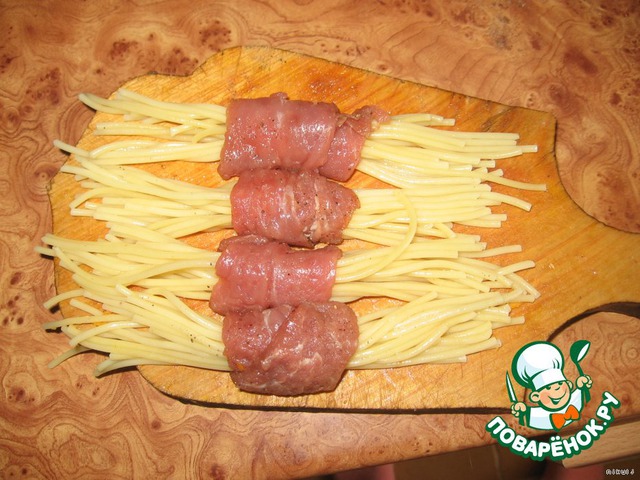 Спагетти разделить на пучочки и каждый завернуть в мяско.