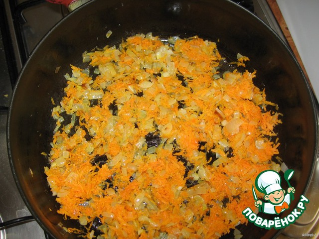 Лук пассеруем на растительном масле, добавляем тертую морковь.