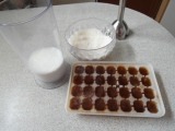 Когда кофе замерзнет, высыпать кубики кофе в стакан для блендера, положить сахар и влить молоко.