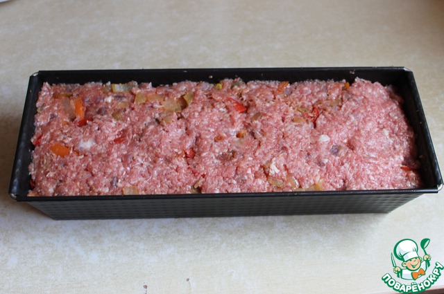 Форму для хлеба смажем маслом оливковым. Наш фарш выкладываем в нее, не до верха. Потому что будет много сока. Ставим в духовку на 1 час при 200гр. Если верх будет пригорать, то закроем фольгой.