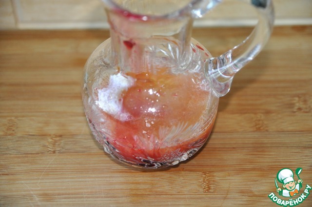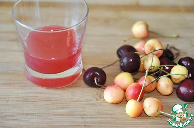 Из черешни отжимаем сок (около 100 мл) с помощью соковыжималки, добавляем сахар, я ещё положила несколько ягод тёмной черешни без косточек для цвета.
