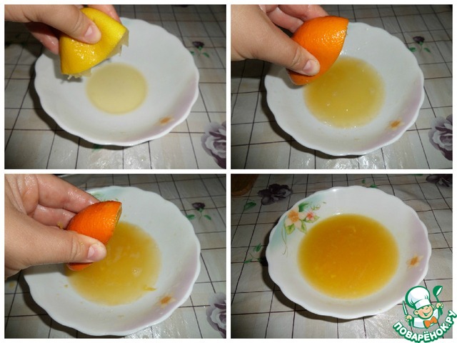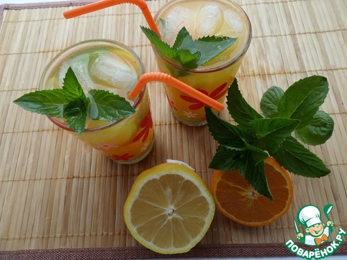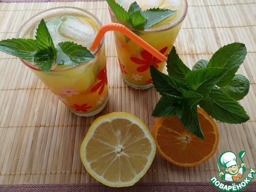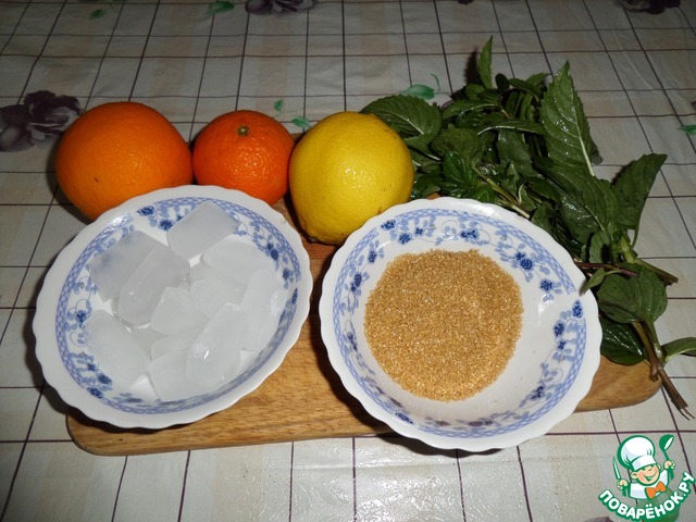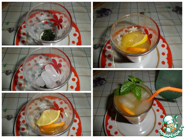 В стакан кладем 1 ч. л. мятно-сахарной смеси. Добавляем 4-5 кубиков льда и отложенные кружки цитрусовых. Наливаем в стакан свежевыжатый сок ( примерно до половины стакана). Доливаем в стакан холодной фильтрованной воды.