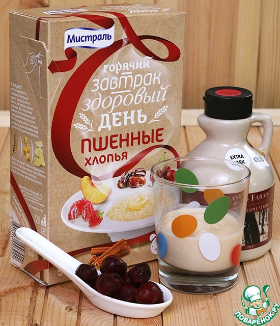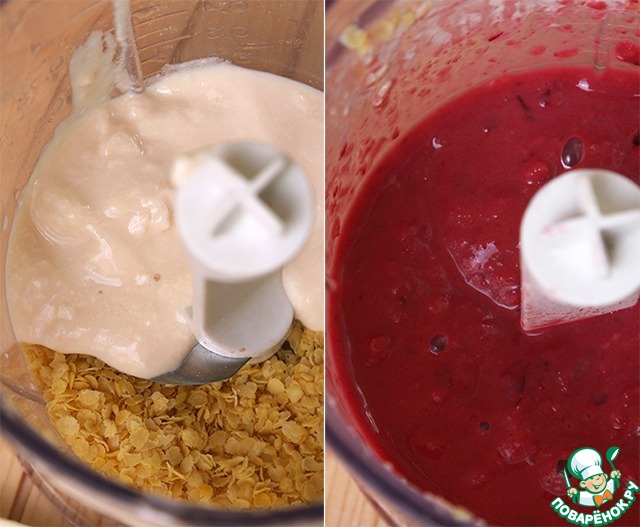 Для заливки хлопьев тут используем холодную ряженку или варенец. Так же даем постоять немного, за тем добавляем остальные ингредиенты и взбиваем.