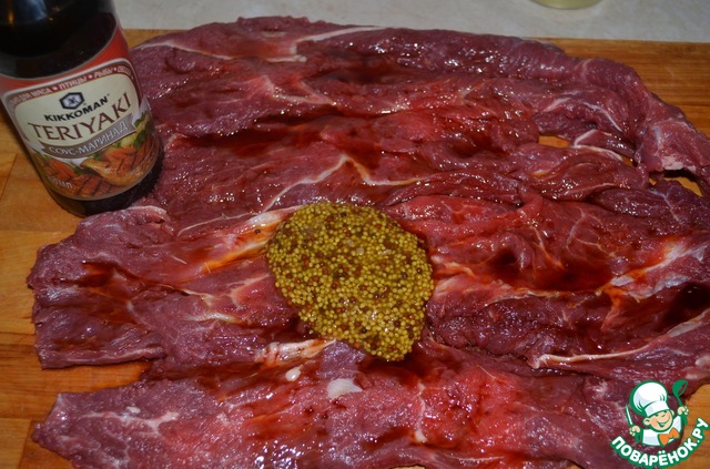 Мясо накрыть полиэтиленовым пакетом и хорошенько отбить. Затем залить соевым соусом "Терияки", добавить горчицу. Хорошенько смазать полученной смесью весь кусочек, со всех сторон.