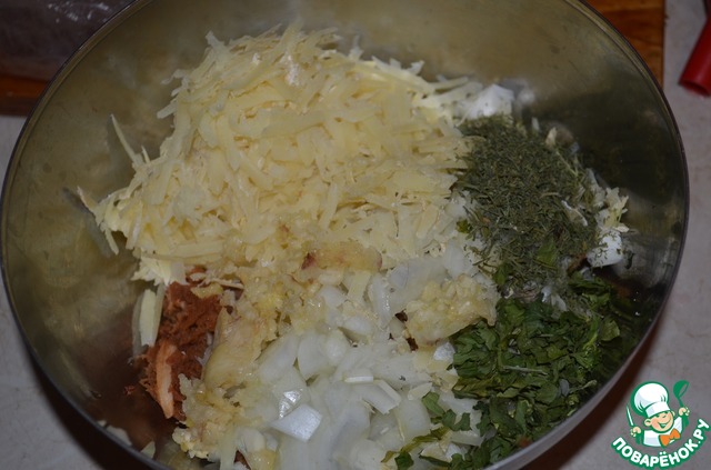 Делаем начинку. Яблоки натрем на терке (я же пропустила яблоки через соковыжималку, сок выпила, а жмых пустила в начинку), туда же добавляем любой твердый сыр. Можно часть сыра заменить сыром с плесенью. Зелень (у меня сушеная), давленный чеснок, лук.