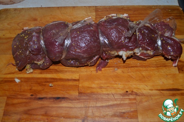 Начинаем заворачивать рулет. У меня шпагата нет, я использую вместо него ленточки от рукава для запекания. Попробуйте и вы-это очень удобно.
