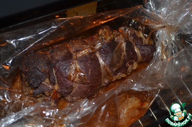 Через час убавляем температуру в духовке примерно до 200 град. и ждем, когда пойдут волшебные ароматы. Через 1,5 часа я открыла пакет, мясо готово. Оставила в горячей духовке еще минут на пять, но не дольше, чтобы мясо не подсохло, и вынула.