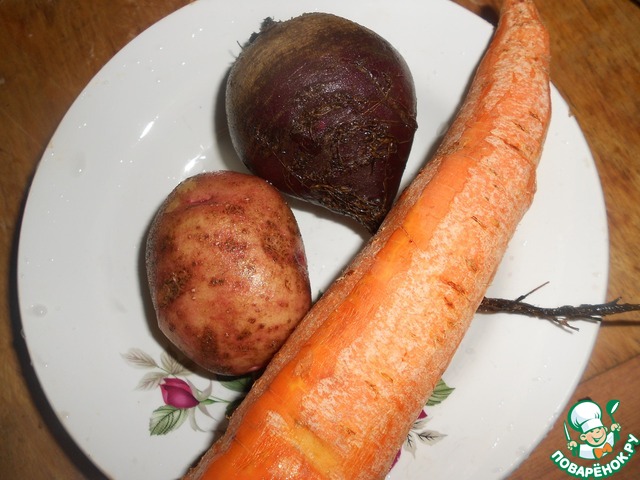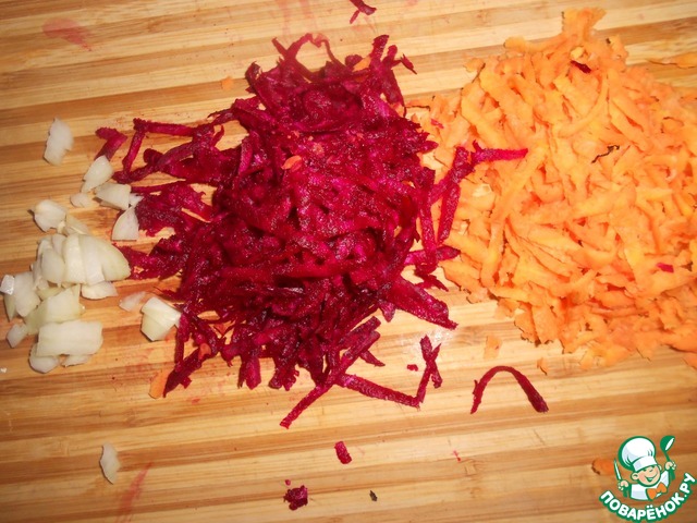 Натереть на крупной терке морковь, свеклу. Нарезать лук.