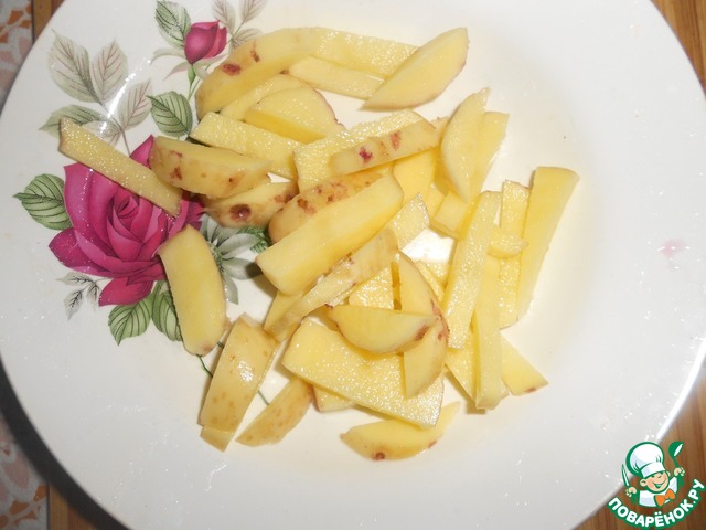 Добавить картофель, нарезанный помидор, залить кипятком, положить бульонный кубик. Т. к. в составе бульонного кубик имеется соль, в борщ соль я не добавляла).