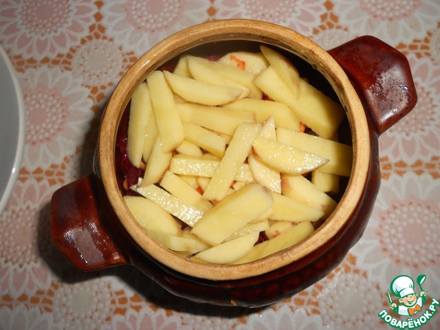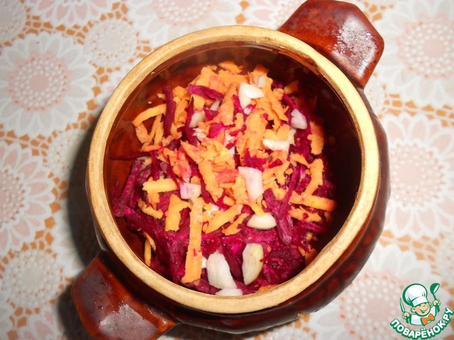 В горшочек (или в другую посуду, подходящую для СВЧ печи) выложить лук, натертые свеклу и морковь.