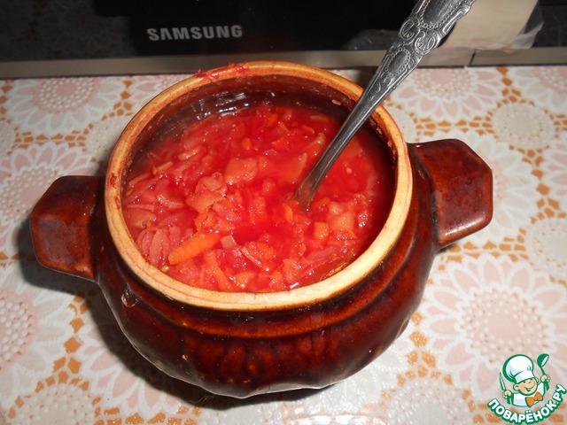 | Быстрый вариант борща в СВЧ печи. Заложила все продукты в горшочек, включила микроволновку и через несколько минут ароматный и вкусный борщ готов! При желании, можно добавить отварное мясо кусочками. |