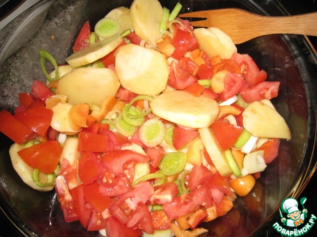 Взять термостойкую посуду, поставить на огонь и смазать оливковым маслом. Выложить картофель и сверху еще немного полить маслом. Хорошо перемешать. Протушить 5 мин. Добавить помидоры, перец, лук-порей. Протушить 5 мин.