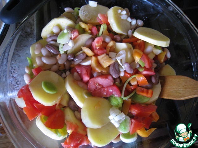Картофель порезать кружочками, помидоры и перец - крупными кубиками, лук-порей - кружочками, но только белую часть. Фасоль предварительно отварить в слегка подсоленой воде.