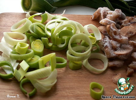 Добавить обжаренный лук-порей с грибами, коньяк и перемешать.
