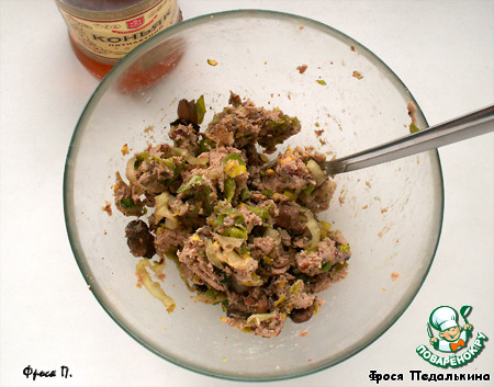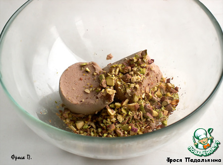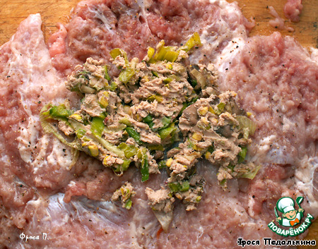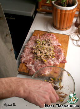 Свинину слегка поперчить. Соль по вкусу, т.к. фисташки тоже соленые. В центр выложить ровным слоем паштет.
