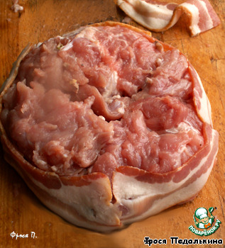 Оборачиваем бекон вокруг свинины, связываем шпагатом.