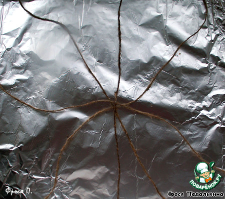 Шпагат нарезать на 4 веревочки, длиной 20-25 см. Выложить их на лист фольги крест-накрест (в виде снежинки), как на фото.