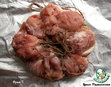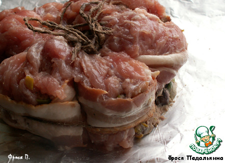 Кладем сверху свинину и завязываем противоположные концы шпагата.
