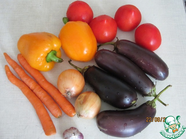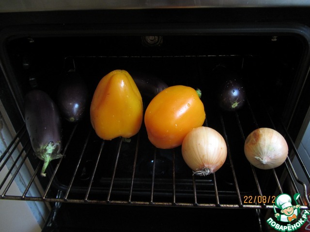 Включаем духовку на 180С. Отправляем на решетку баклажаны, перец, лук в шелухе. Через 20 минут перевернуть. Время приготовления приблизительно 30 минут. Зависит от размера овощей и самой духовки. Баклажаны должны стать мягкими, но не как вяленый банан )), кожица у перца вздуется и будет хорошо отходить от мякоти, лук может пустить сок. Хотя мне один раз попался перец который абсолютно не чистился. Можно также запечь небольшой кабачок, у меня не оказалось.