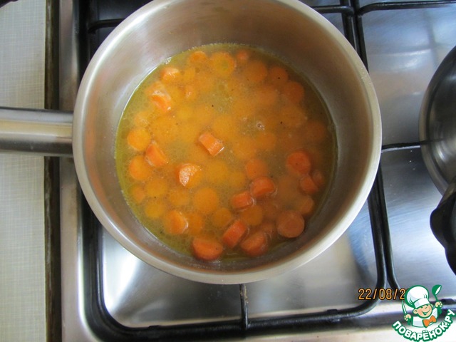 Морковь режем крупными кубиками. У меня кольца, тк морковка молодая и мелкая. В сотейник 2 ст. л масла и отправляем на огонь. Морковь пассеруем около минуты. Добавляем щепотку соли и черный молотый перец.