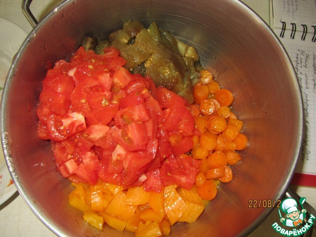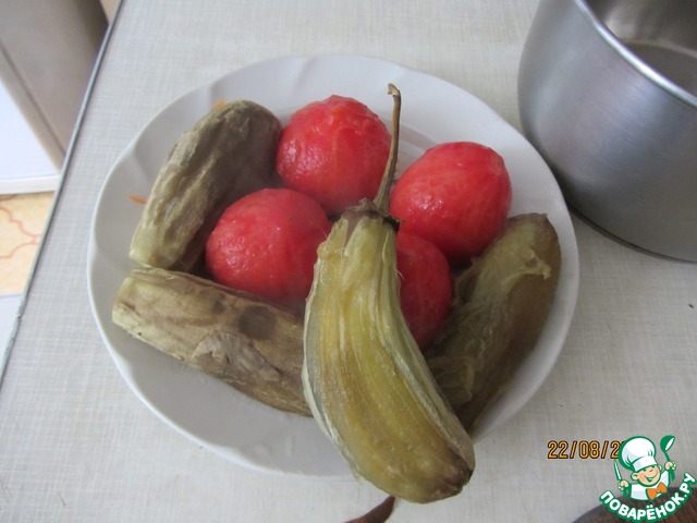 Помидоры ошпариваем кипятком и снимаем кожицу. Баклажаны у меня приготовились первыми минут через 25 (в духовке остались лук и перцы), очищаем горячими. Кожица снимается легко. Режем кубиками помидоры и баклажаны и отправляем в кастрюлю.