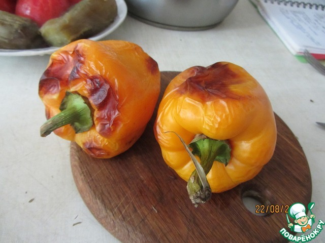 Пока нарезала овощи, зарумянились перцы. Очищаем от кожицы и удаляем семена с плодоножкой. Внутри перца сок, который мы отправляем также в салат. Перец порезать кубиками.