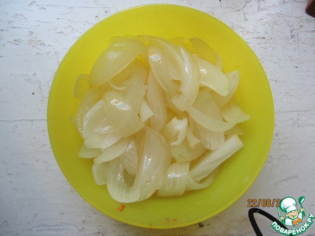 Итак, пришел черед лука. Он стал мягким и сочным. Аккуратно очищаем, тк он очень горячий. Нарезаем крупными "лепестками". Добавляем пол ч. л. соли, 1 ч. л. сахара, пол ч. л. уксуса и столовую ложку масла. Перемешиваем и оставляем мариноваться на 5 минут.