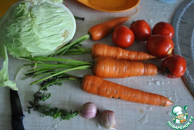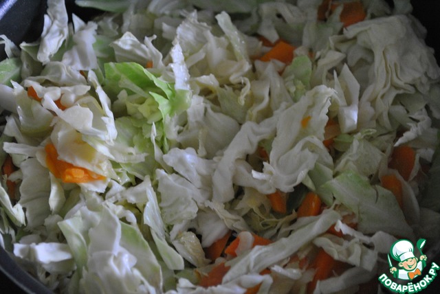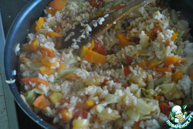 Варим рис. Напомню, сварить нужно 1 стакан, но не до полной готовности. После того, как поставили, на сковороду с высокими бортиками, высыпаем нарезанный лук, потом морковь (её можно натереть на тёрке, или мелко нарезать, или измельчить в комбайне), капусту, чили, чеснок и помидоры.