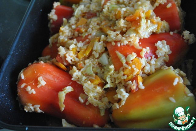 Теперь фаршируем наши перцы. С помощью ложечки, плотненько упаковываем в них начинку и выкладываем в форму. Оставшуюся начинку кладём между ними и поверх перцев. Равномерно выливаем сверху оставшийся соус.