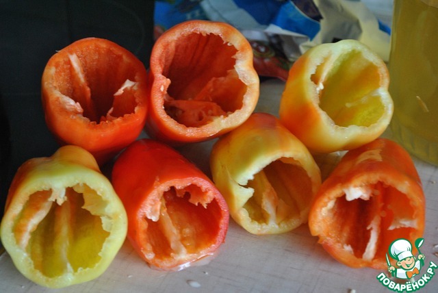 Тем временем, моем и чистим перцы. Удаляем серединку, вымываем изнутри зёрнышки.