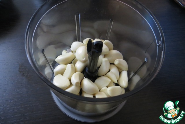 Чистим чеснок. Как я уже сказала, получается ооочень остро. Я предпочитаю менее острый горлодёр, поэтому чеснока беру не 2 стакана чистых зубчиков, а 1,5.