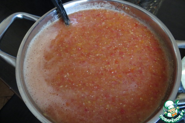 А теперь измельчаем наши помидоры и чеснок любым способом: пропускаем через мясорубку, или через комбайн, или просто натираем на терку. Добавляем соль. Все хорошо перемешиваем. Пробуем на соль и, при необходимости, досаливаем.