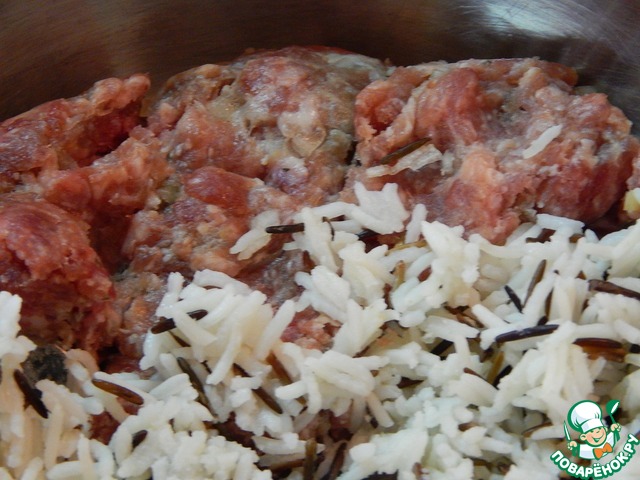 Смешиваем мясной фарш (в который добавлен лук и любимые специи) и рис.