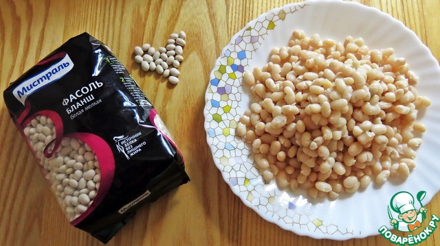 Я использую белую мелкую фасоль "Бланш" от ТМ "Мистраль". Заранее отварила одну упаковку фасоли, следуя рекомендации на пачке. Замочила на 4 ч., а затем варила до готовности около 1,5 ч. В отваренном виде, она прекрасно хранится в холодильнике. Таким образом, её удобно использовать в течение недели для нескольких блюд!
