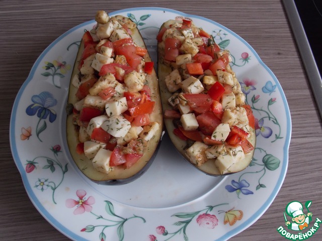 В это время нарежем помидор, моцареллу и перец на кубики, добавим каперсы, зелень, перец, соль, бальзамик, оливковое масло, натертый на мелкой тёрке чеснок ( по желанию). Баклажаны вымоем вместе с мякошью и обсушим. Мякиш нарежем на кубики и добавим к оващам