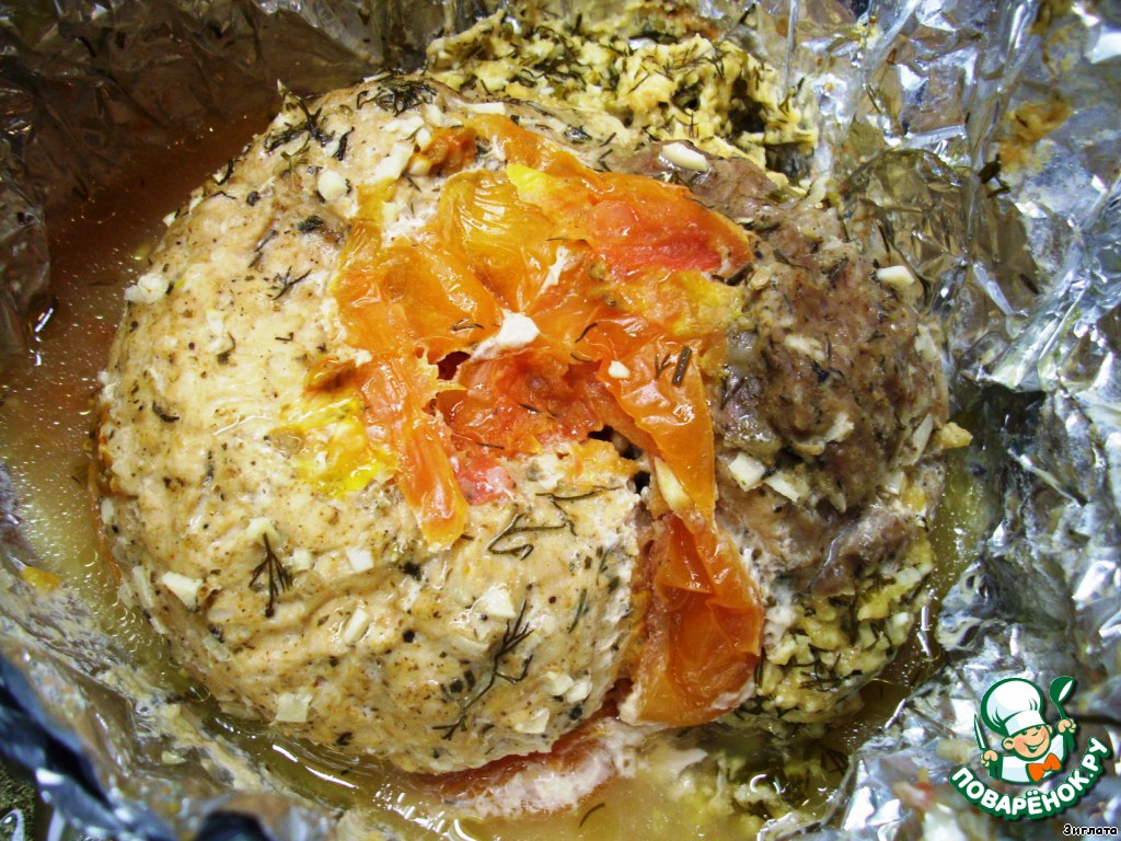 "Улитку" уложить в фольгу (2-3 слоя), для сочности добавить нарезанный дольками помидор.