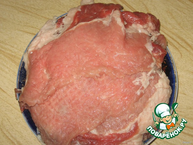 Свинину нарезать на кусочки, отбить через пленку тоненько.