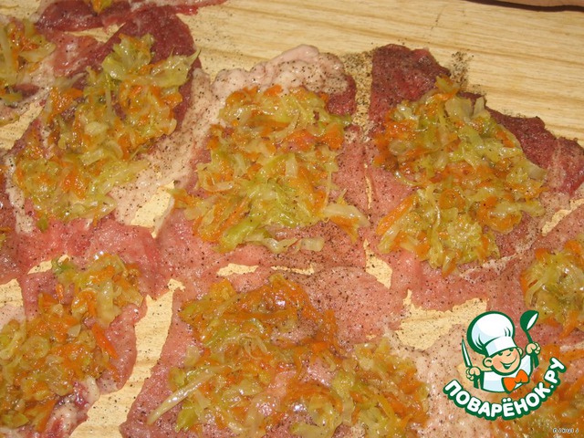 Раскладываем нашу свининку, солим, перчим, посыпаем приправками (обе стороны) и раскладываем начиночку равномерно по всему мяску.