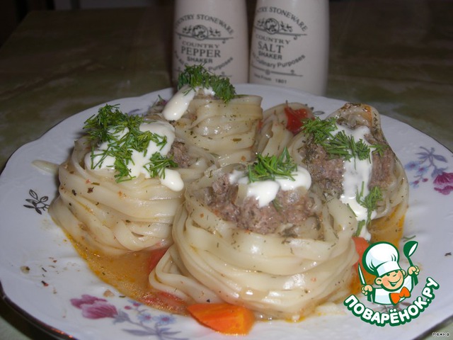 Берем гнезда (я покупаю готовые в супермаркете) и наполняем их фаршем. Выкладываем их на сковородку с зажаркой и заливаем любым мясным бульоном (до верху гнезд).