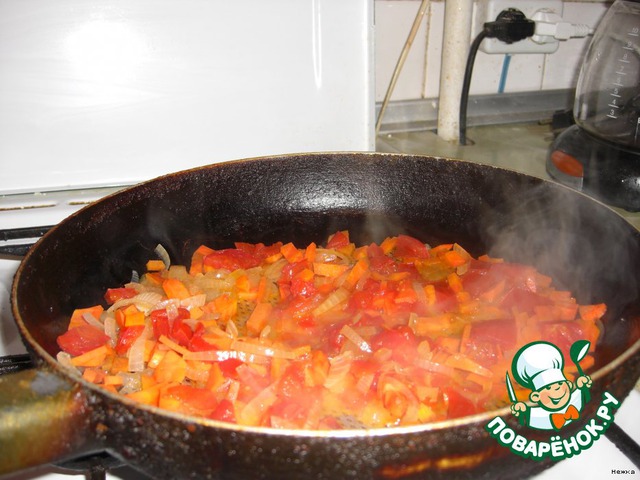 В глубокой сковородке обжарить мин 10 порезанный лук, морковь и помидор. Накрыть крышкой и тушить на среднем огне мин 5-10.