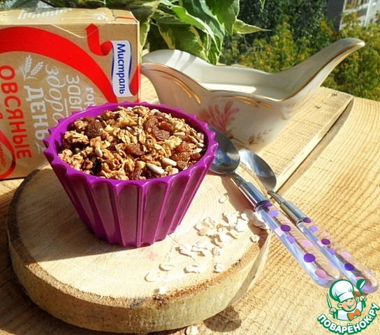 Выложить из противеня и добавить изюм. Пока мюсли теплые мне очень нравится залить их молоком, а в остывшем виде очень вкусно с низкокалорийной ряженкой или кефиром. Можно украсить сверху любимыми ягодами.
