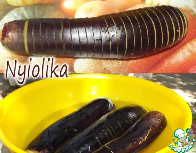 Баклажаны помыть, сделать надрезы почти до конца и опустить в хорошо посоленную холодную воду, на время пока чистится морковь и помидоры, и все нарезается.